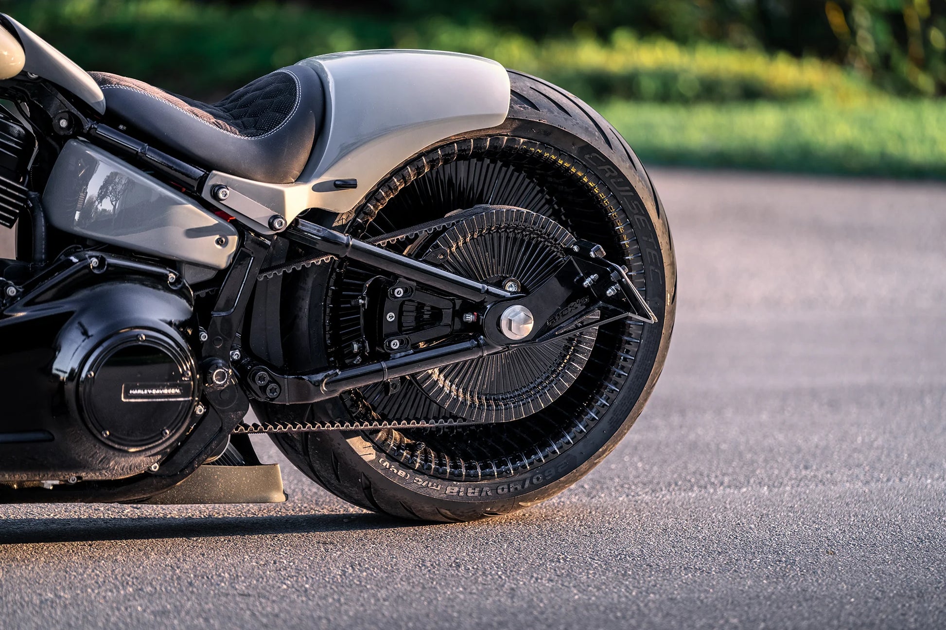 Rick's Motorcycles ofrece un kit completo de reubicación de freno trasero, diseñado para modelos Softail de 2018 en adelante. El kit incluye un disco trasero especialmente modificado, una pinza personalizada, soportes de chasis y espaciadores. La instalación implica soldadura, fresado de poleas y aplicación de pintura en polvo para garantizar un ajuste preciso y duradero.